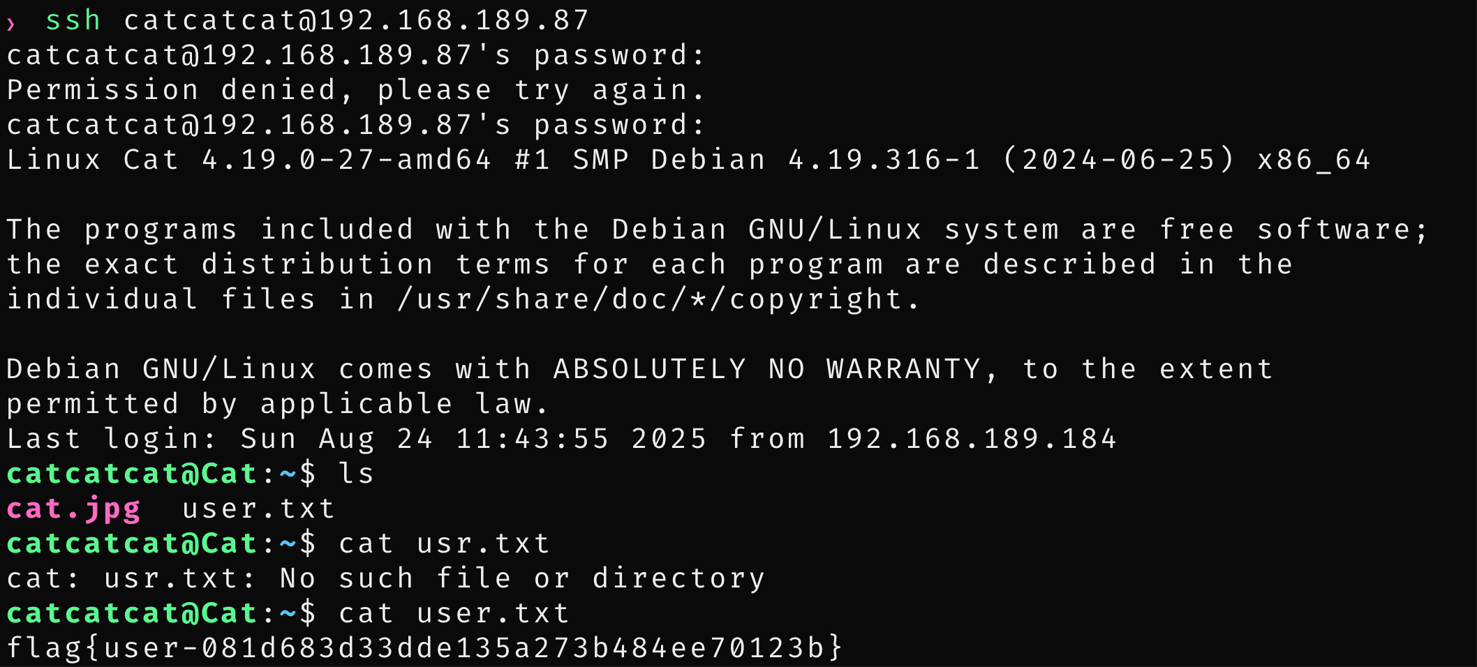 root@Cat:~# cat root.txt /home/catcatcat/user.txt